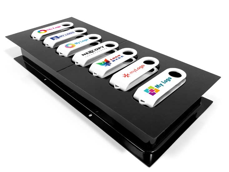 Using the Nexcopy seven slot USB Clip Printer™ and Nexcopy inkjet printable clips, quickly and easily print full color logos in about 35 seconds.