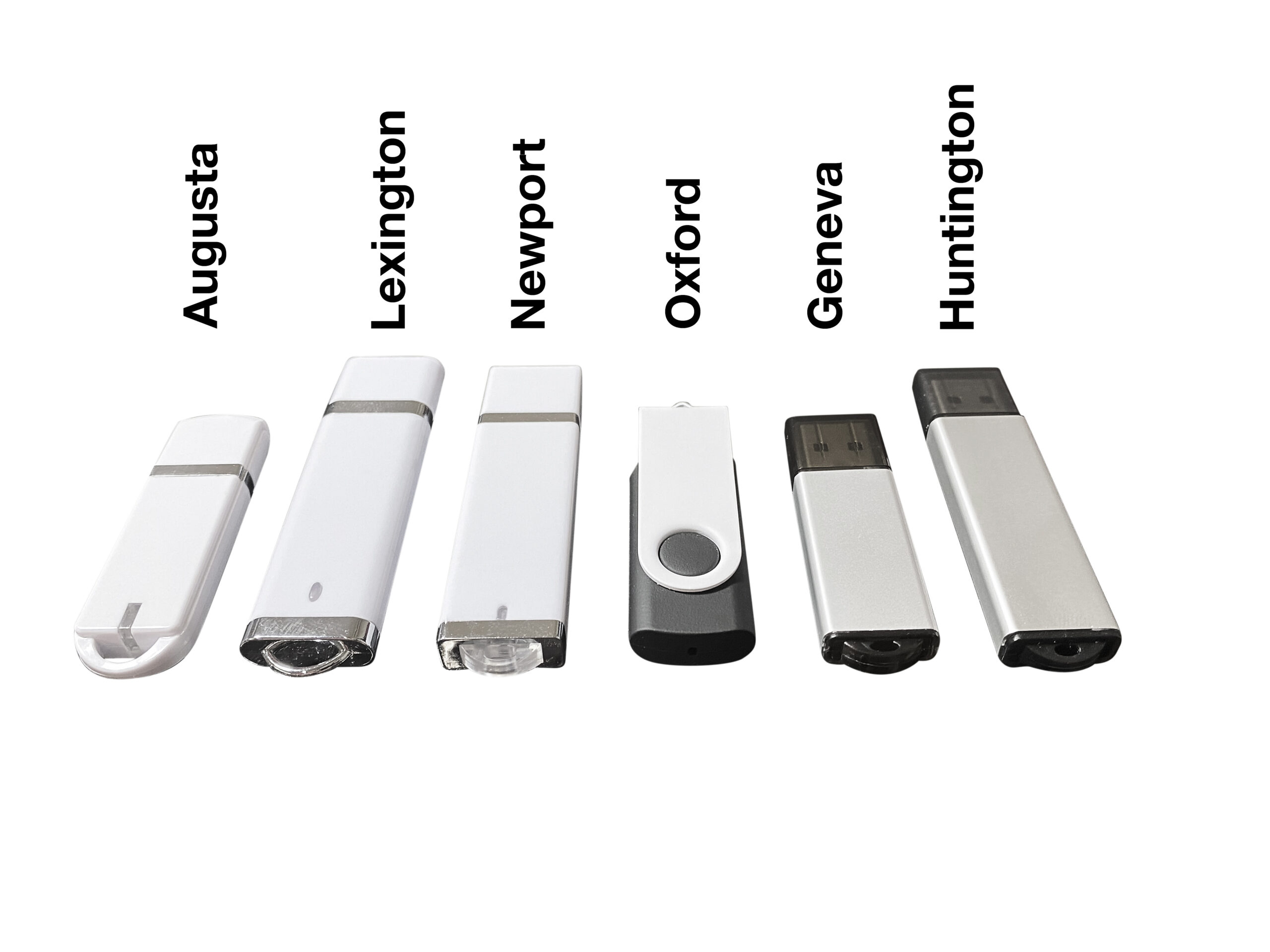 The Oxford style swivel drive is the in stock media Nexcopy carries for same day printing and shipping. Nexcopy inventories USB 2.0 media of 2GB and 4GB capacity and in stock USB 3.0 media of 8GB, 16GB, 32Gb, 64GB and 128GB capacities. The in stock Oxford media is a black body with white swivel clip with full color printing via the Nexcopy Logo-EZ USB flash drive printer.
